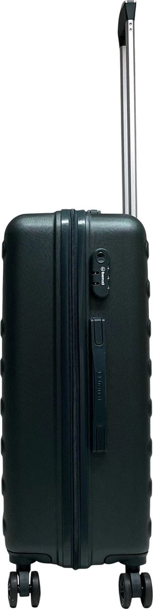 Middelgrote hardschalen koffer van het merk Benzi. De koffer is voorzien van een ritssluiting rondom die op slot te zetten is middels een vast cijferslot op de zijkant van de koffer. Binnenin gevoerd, spanbanden en tussenschot met ritssluiting. Op het tussenschot zit een ritsvak en twee steekvakken voor het overzichtelijk opbergen van kleine reisaccessoires.