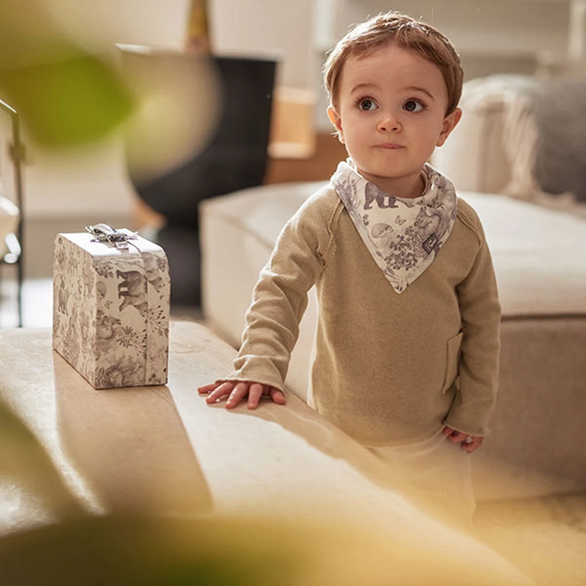 Op elk item zie je het lieve bosdieren printje terug, sommige met een grote panelprint, sommige met een all-over printje. De print heeft een off-white ondergrond met een grijze print.